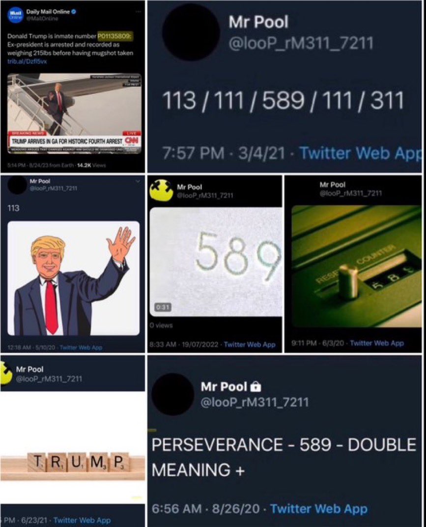 | xoom@Mr_Xoom · July 14 Trumps inmate number when was arrested was 1135089 113 - 589 That pool post 113/111/589/111/311 113 - 311 ‘Will you be here when it’s all over?’ Full circle ⭕️ Plans within plans 체포 당시 트럼프의 수감자 번호는 1135089였다. 113 - 589 그 수영장 포스트 113/111/589/111/311 113~311 '모든 일이 끝나면 여기에 계실 건가요?' 완전한 원 ⭕️ 계획 속의 계획 |