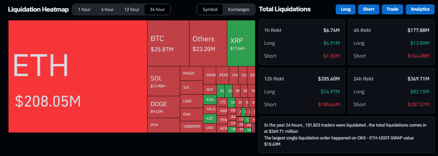 참고로, 지난 24시간 동안 2억 800만 달러 상당의 이더리움 포지션이 청산되었으며, 이는 선물 시장에서 발생한 총 3억 6,970만 달러 손실의 56% 이상을 차지했습니다. 이 중 1억 8,360만 달러는 공매도 포지션이었고, 2,440만 달러만이 영향을 받았습니다.